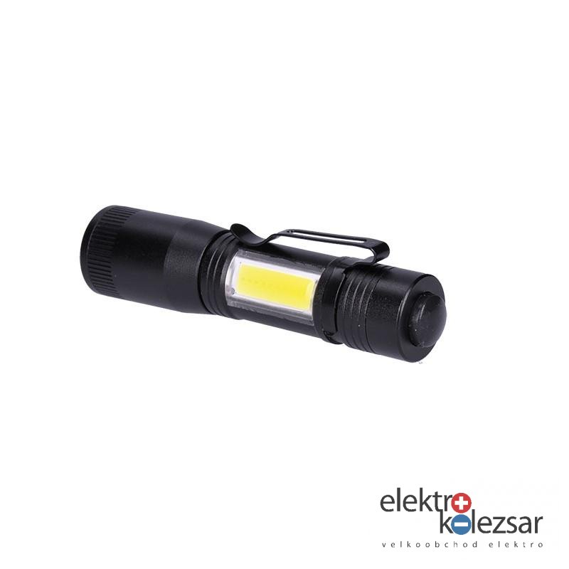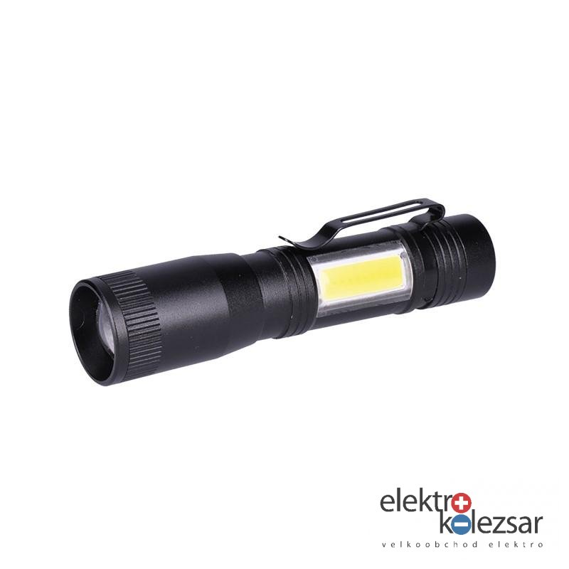 Kvalitní kovová LED svítilna s hlavním 3W zdrojem a přídavným bočním COB světlem nabízí 4 režimy svícení – 100 %, 50 %, COB 100 % a blikání COB. Tělo z hliníku je vybaveno možností regulace světelného kuželu (zoom/fokus) a zajišťuje odolnost i při náročnějším použití.