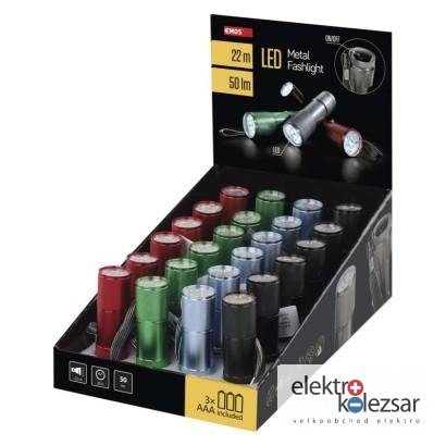 barva: mix barev|baterie součástí balení: ano|doba nabíjení: neuvádí se|doba svícení: 30 h|doba svícení detail: LED 100 % – 30 h|dosvit: LED 100 % – 22 m|fokus: ne|hmotnost: 71 g|LED indikace nabíjení: neuvádí se|LED indikace stavu akumulátoru: neuvádí se|materiál: hliník|maximální dosvit: 22 m|maximální světelný tok: 50 lm|nabíjecí: ne|napájení: 3× AAA|nárazuvzdornost: ano|počet režimů svícení: 1|příslušenství: neuvádí se|prodejní obal: 24 ks, display box|režimy svícení: LED 100 %|rozměr: 88 × 26 × 26 mm|speciální funkce: neuvádí se|světelný tok: LED 100 % – 50 lm|typ baterie: LR03 (1,5 V)|typ napájecího konektoru: neuvádí se|voděodolnost: neuvádí se|vybavení: neuvádí se|záruční doba: 2 roky|zdroj světla: 9× LED|značka: EMOS